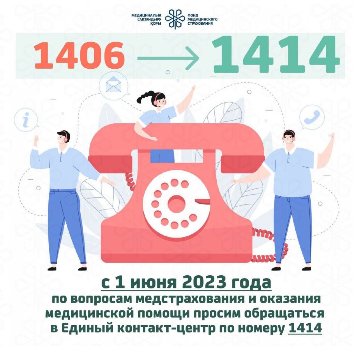 Филиал по Костанайской области НАО «Фонд социального медицинского страхования» сообщает, что с 1 июня 2023 года все консультации по вопросам медицинского страхования и оказания медицинской помощи, которые ранее осуществлялись через контакт-центр Фонда по номеру 1406, предоставляются Единым контакт-центром по номеру 1414